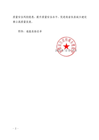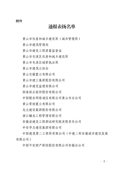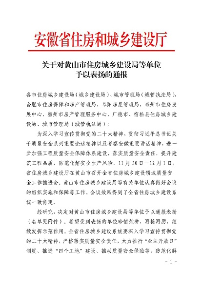近日,安徽省住房和城乡建设厅印发《关于对黄山市住房和城乡建设局等单位予以表扬的通报》,《通报》指出,11月30日-12月1日,省住房和城乡建设厅在黄山市召开全省住房建设领域质量安全工作推进会,会议效果得到全省住房城乡建设系统一致肯定,并对在此次会议认真做好组织实施和保障的单位予以通报表扬,开云网页版-开云(中国) 作为唯一一家本土建筑施工企业荣获表扬。