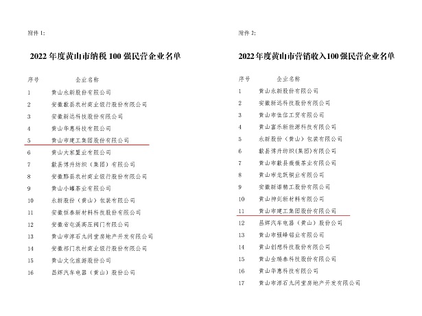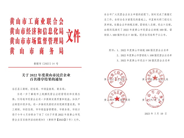 日前,由黄山市工商联、市经信局、市监管局及市商务局联合发布2022年度黄山市民营企业纳税及营销收入百强名单公布,开云网页版-开云(中国)