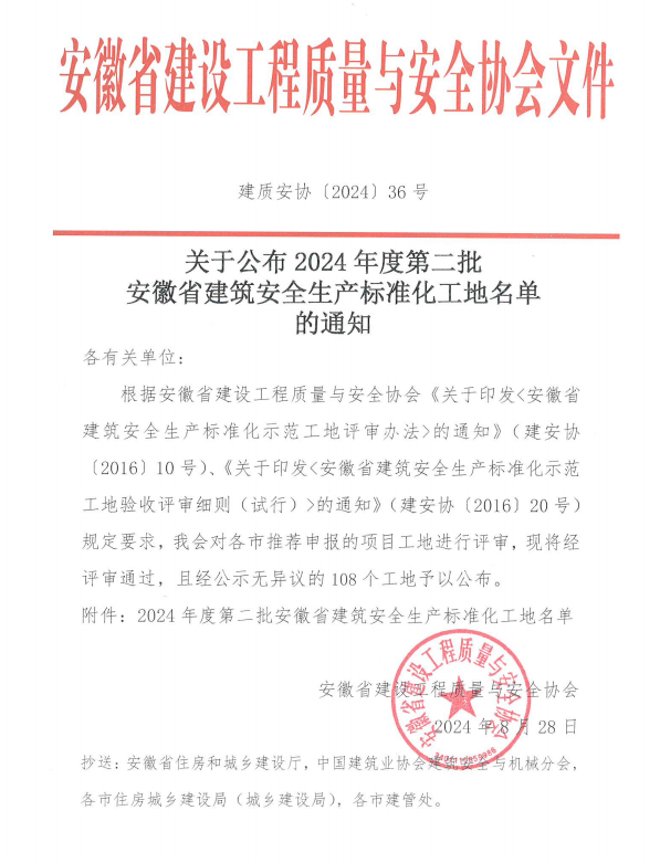 近日,安徽省建设工程质量与安全协会公布2024年度第二批安徽省建筑安全生产标准化工地名单,由开云网页版-开云(中国)