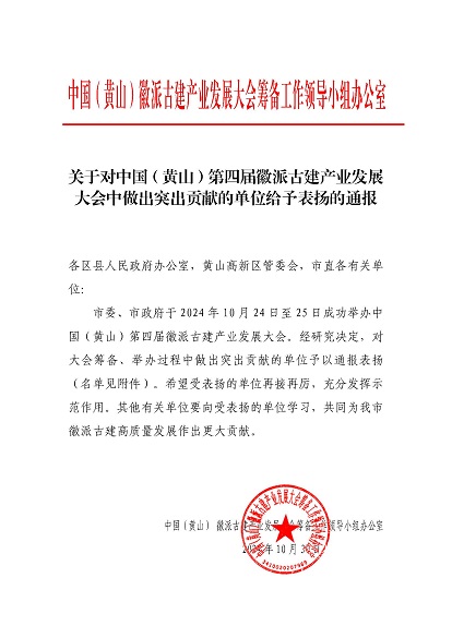 市委、市政府于2024年10月24日至25日成功举办中国(黄山)第四届徽派古建产业发展大会。近日,中国(黄山)徽派古建产业发展大会筹备工作领导小组办公室发布《关于对中国(黄山)第四届徽派古建产业发展大会中做出突出贡献的单位给予表扬的通报》,开云网页版-开云(中国) 荣列其中。