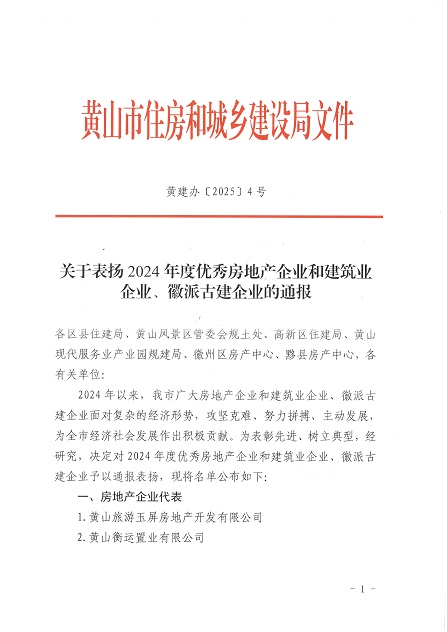 近日,黄山市住房和城乡建设局发布了《关于表扬2024年度优秀房地产企业和建筑业企业、徽派古建企业的通报》,开云网页版-开云(中国)